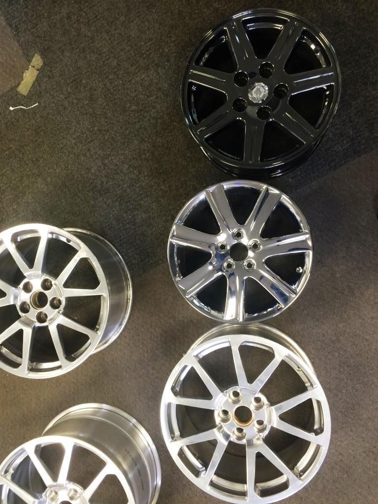 Once I received the rims back from Eric, I took them to The Wheel Warehouse (local wheel shop to me) to get refinished. I wanted something durable, easy to maintain, and looked good. I’ve never been much of a “chrome” guy, but the PVD finishes are awesome. I was considering the PVD Black Chrome hard, it looks good on any color and many other V’s on here have proved that. But once I seen it in person the Black Chrome finish they offered was very dark to me, almost too black. Some of you who have PVD Black Chrome rims your finish seems more anthracite or gun metal compared to how these were in person. This pic here shows how the stock CTS-V Polished rim compared to their PVD finish options. Top Rim: CTS-V Polished Rim Middle: PVD “Bright” Chrome Bottom: PVD Black Chrome.