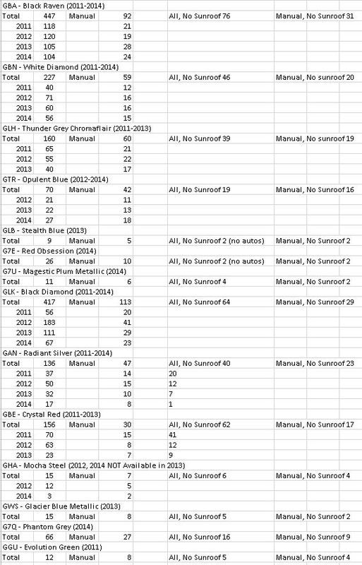 Color table for wagons complete. Remember, totals are all, manuals are manuals, auto guys you have to do some math. Does anyone here own the ONLY 2014 Mocha Automatic? That's the only one of one car created by this list alone. Granted there were other Mocha autos in 2012.
